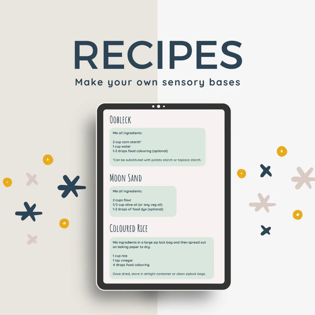 The guide includes recipes to make your own sensory bases, such as no-sugar jelly, fizz for potion play, coloured rice and more.
